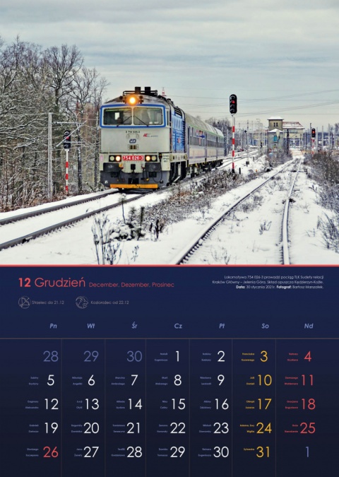 Edycja kultowego Kalendarza Kolej Podsudecka na 2022 rok. Pięknie wydany, zawierający unikalne zdjęcia kolejowe prezentujące wyjątkowość Magistrali Podsudeckiej. Wysokiej jakości druk na papierze kredowym. 13 stron (12 stron na każdy miesiąc i okładka). Format A3 (29,7 cm szerokości i 42,0cm wysokości). Każdy miesiąc z kalendarium, numerem tygodnia, solenizantami, znakami zodiaku i informacjami o najważniejszych świętach. Zawieszka ułatwiająca ekspozycję kalendarza na ścianie.