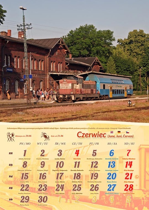 Kalendarz ma format A3 (29,7cm szerokości × 42,0cm długości/wysokości) i składa się z 13 stron. Po jednej stronie na każdy miesiąc roku plus okładka. Na stronie miesiąca piękne duże zdjęcie kolejowe (każde opisane) oraz kalendarium z nazwami świąt lub solenizantami. Do tego numery tygodni, nazwy miesięcy w językach niemieckim, czeskim i angielskim, a także informacje o obowiązujących znakach zodiaku. Całość wydana na wysokiej jakości papierze.